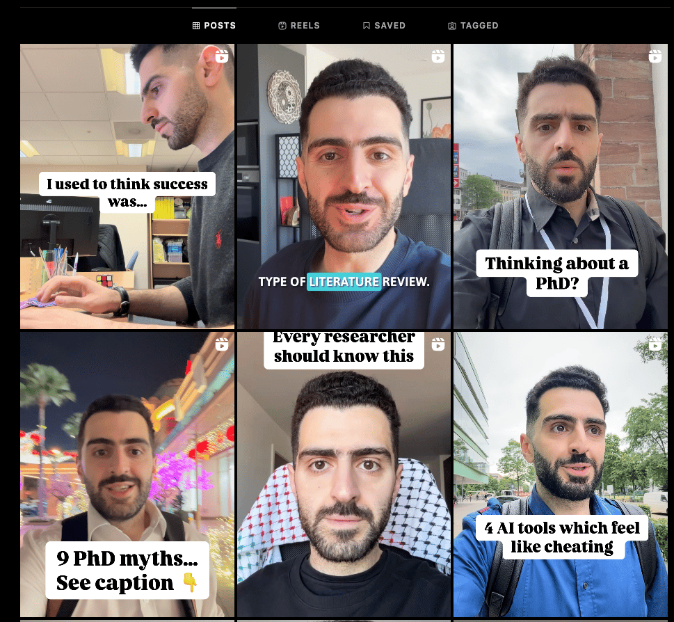 Check us out on Instagram to discuss everything related to academia—from writing PhD theses and literature reviews to CV tips and publishing papers. Follow for personalised stories and reels, including frequent videos where I share academic tips and insights directly with you.