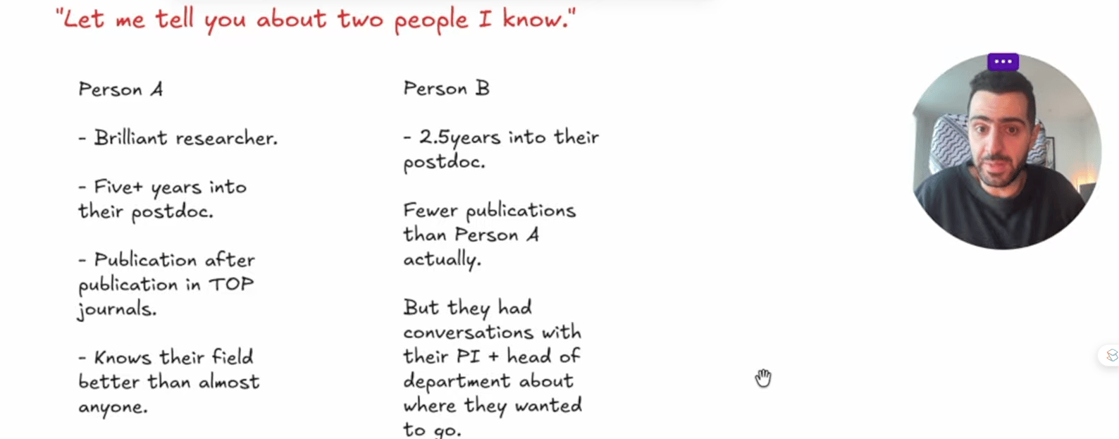 Hiring committees, promotion panels, and grant reviewers all work from frameworks. There are metrics, thresholds, and specific things they are looking for, and many of those things are not obvious from the outside. Most researchers spend their time optimising for what feels productive rather than what is actually being measured. The fix is straightforward but rarely done: find out what the criteria actually are, and then work backwards from them deliberately rather than hoping your instincts are aligned with what the system rewards
